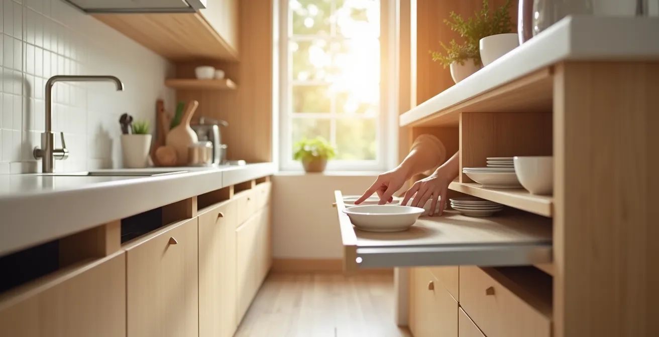 - Optimiser les espaces difficiles : Pour les placards bas, installez des tiroirs ou des paniers coulissants. Pour les placards hauts, réservez-les aux objets d’usage rare (service de fête, archives) et utilisez une pince de préhension pour y accéder ponctuellement, plutôt qu’un escabeau.