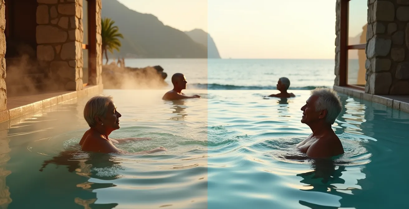 Beaucoup pensent que la seule différence réside dans l’origine de l’eau. C’est la partie visible, mais anecdotique, de l’iceberg. Le véritable enjeu, celui qui déterminera si vous dépensez votre argent pour une parenthèse de détente ou pour un véritable traitement de fond, se cache ailleurs. Il ne s’agit pas de choisir entre l’eau de mer et l’eau de source, mais entre un protocole thérapeutique encadré et une expérience de bien-être à la carte. La véritable question est : cherchez-vous une détente ponctuelle ou une rémission durable de vos douleurs ?